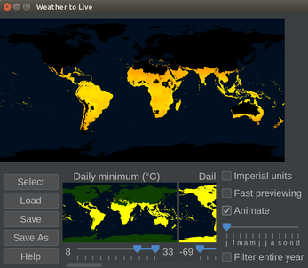 - Execute weather-to-live.jar, start.cmd, or start.sh by double-clicking or from a terminal. The latter two claim 19GB of free memory and fail when that's not available. The former will fail when trying to load the largest data sets.